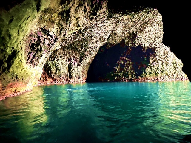 積丹半島(小樽の西、神威岬の近く)にある海蝕洞窟。夏場のみ小樽港から観光船が出ていて、晴れた日は海面が コバルトブルー〜エメラルドグリーンに発色する。北海道の青の洞窟と呼ばれるが、正式名は「神威岬・青の洞窟」系の海食洞群。