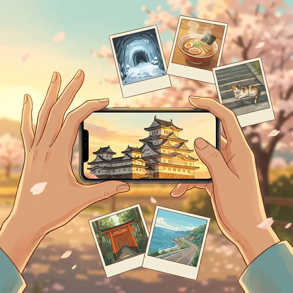 旅先でスマホを構える手元と、日本各地の風景ポラロイド